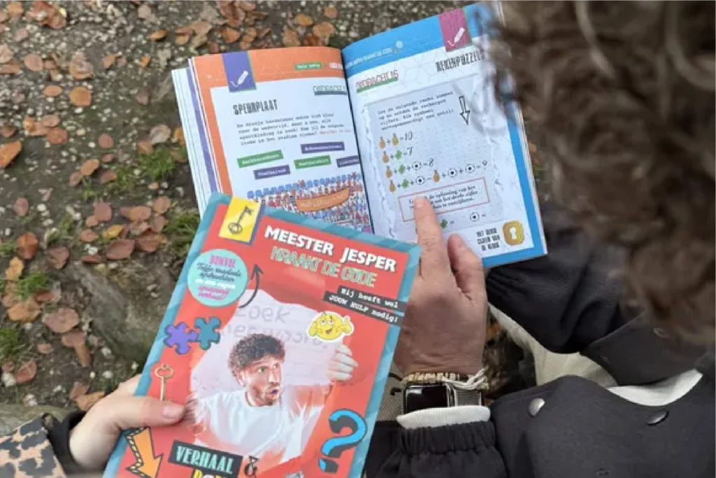 Naast de show ontwikkelden we een doe-boek dat thematisch aansloot op het verhaal en kinderen motiveerde om thuis verder te puzzelen, ontdekken en leren. Ook lanceerden we een reeks schoolspullen en merchandise, volledig in lijn met het universum van Meester Jesper.